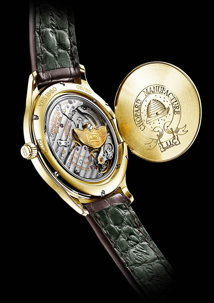 El nuevo reloj L.U.C XPS 1860 Officer está lleno de secretos y de símbolos. Por un lado, tiene una esfera de oro de 18 quilates decorada con un motivo alveolado de extraordinaria elegancia realizado en guilloché a mano. Por el otro tiene un fondo officier, también en guilloché, que se abre y permite observar el movimiento ultraplano L.U.C 96.01-L de 33 mm. Equipado con el primer calibre de Chopard Manufacture presentado en 1997, provisto de la tecnología Chopard Twin y de un microrrotor de oro de 22 quilates, el modelo L.U.C XPS 1860 Officer representa toda la elegancia y la buena factura de la Alta Relojería. Realizado en una caja de oro ético amarillo de 18 quilates de 40 mm de diámetro y decorado con una esfera de color Forest Green, este reloj limitado a 50 piezas está certificado Cronómetro y ha sido reconocido con el Punzón de Ginebra. Viste la muñeca de los gentlemen contemporáneos con distinción y discreción. ´