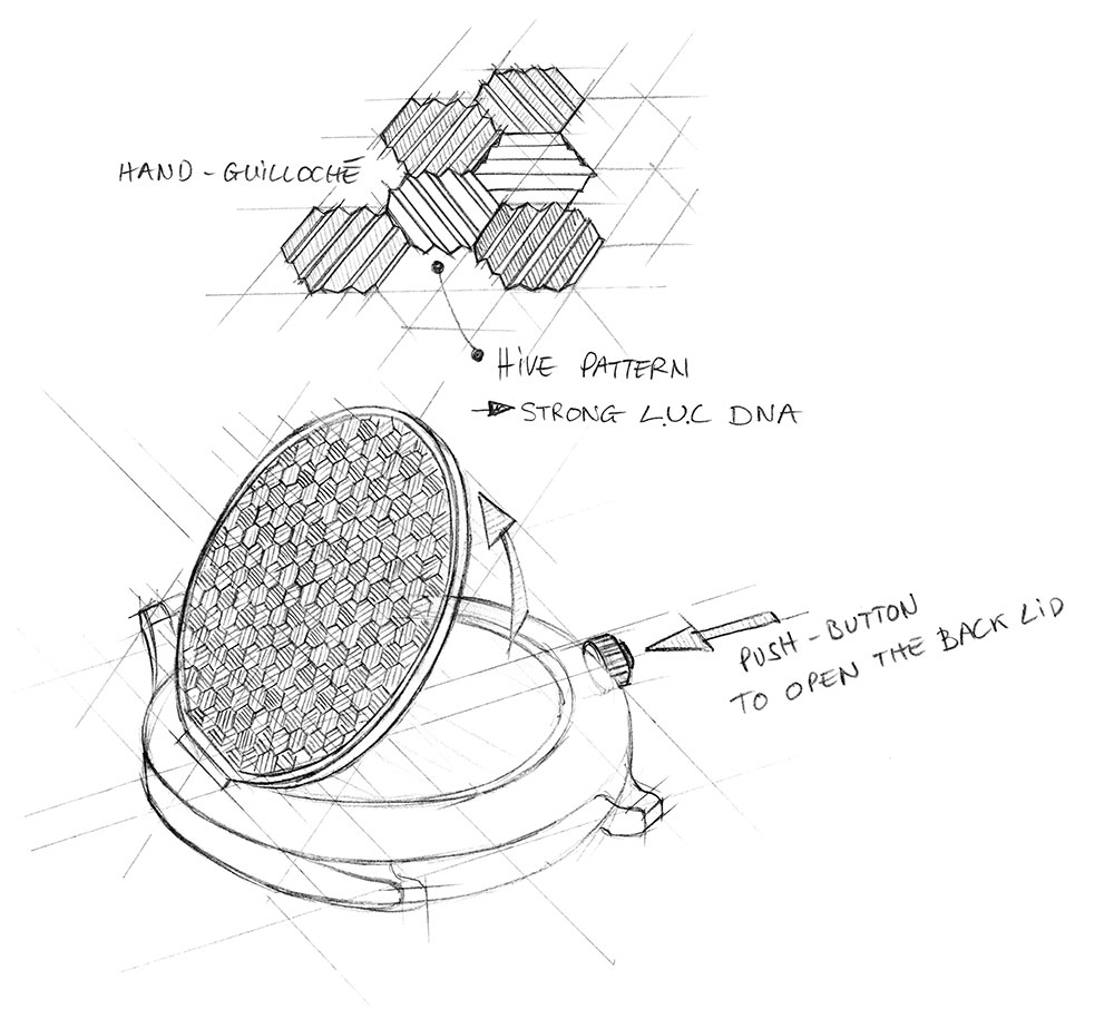 El interior de la tapa del L.U.C XPS 1860 Officer recupera el grabado a mano de la colmena y las abejas, que colocadas de forma aleatoria hacen que cada uno de los ejemplares sea totalmente único. Además de su interés ornamental, estos diferentes grabados hacen referencia a las virtudes que definen a la abeja: trabajadora, íntegra, modesta y pieza fundamental de un grupo que se mantiene unido por medio de la colaboración y el trabajo. La elegancia del modelo L.U.C XPS 1860, sus proporciones perfectamente estudiadas y que jamás pasan de moda, la calidad de su fabricación, acreditada por el Punzón de Ginebra, se reflejan en el criterio moral que ha inspirado su creación.
