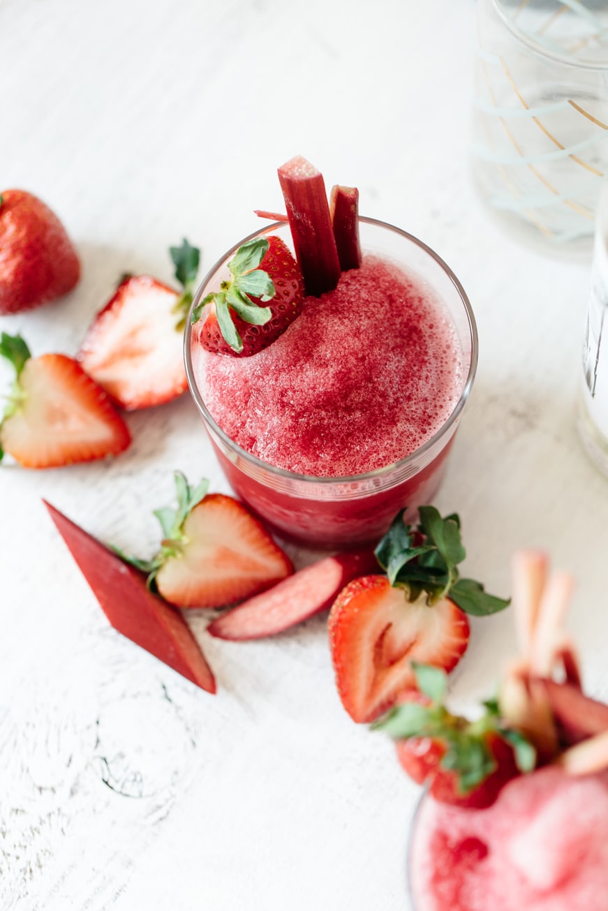 - Verter el contenido en un vaso y decorar con una fresa y un tallo de ruibarbo.