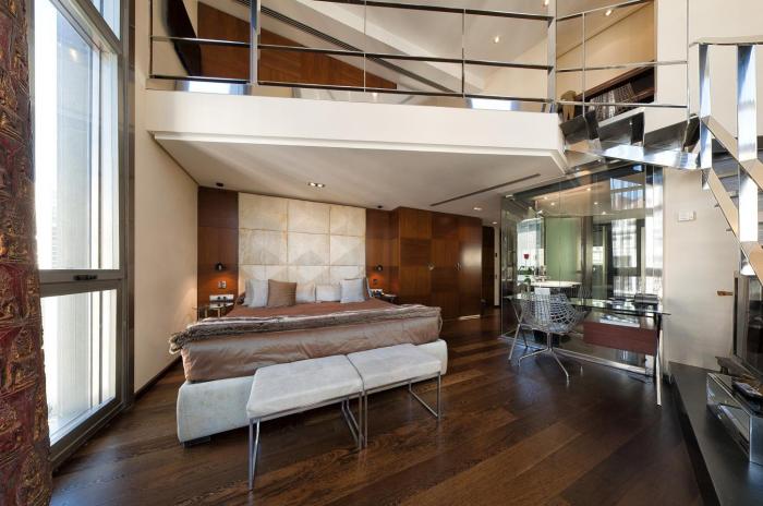 Las alfombras decó y muebles de acero combinan en las habitaciones con el mobiliario del arquitecto J. Hoffman, sillas transparentes Meridian de Driade, cabezal de la cama y mesitas de cristal de Triade, sofá de cuero italiano y sanitarios Starck de Duravit. La Suite Loft se presenta como una obra de arte en sí misma, donde, además, prevalece la comodidad.